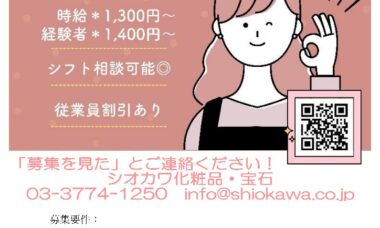 続きを読むシオカワ化粧品・宝石 スタッフ募集 #従業員募集 #雇用 #就労 #販売員 #化粧品 #宝飾品 #宝石